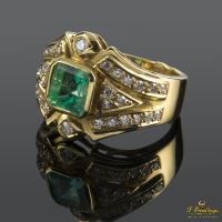 SORTIJA DE ORO AMARILLO CON 1 ESMERALDA NATURAL CENTRAL TALLA PRINCESA ENGASTADA EN CHATÓN Y 32 DIAMANTES NATURALES TALLA BRILLANTE ENGASTADOS EN GRANO.