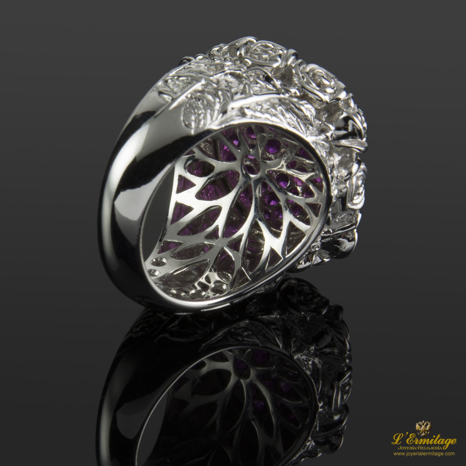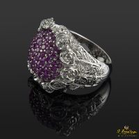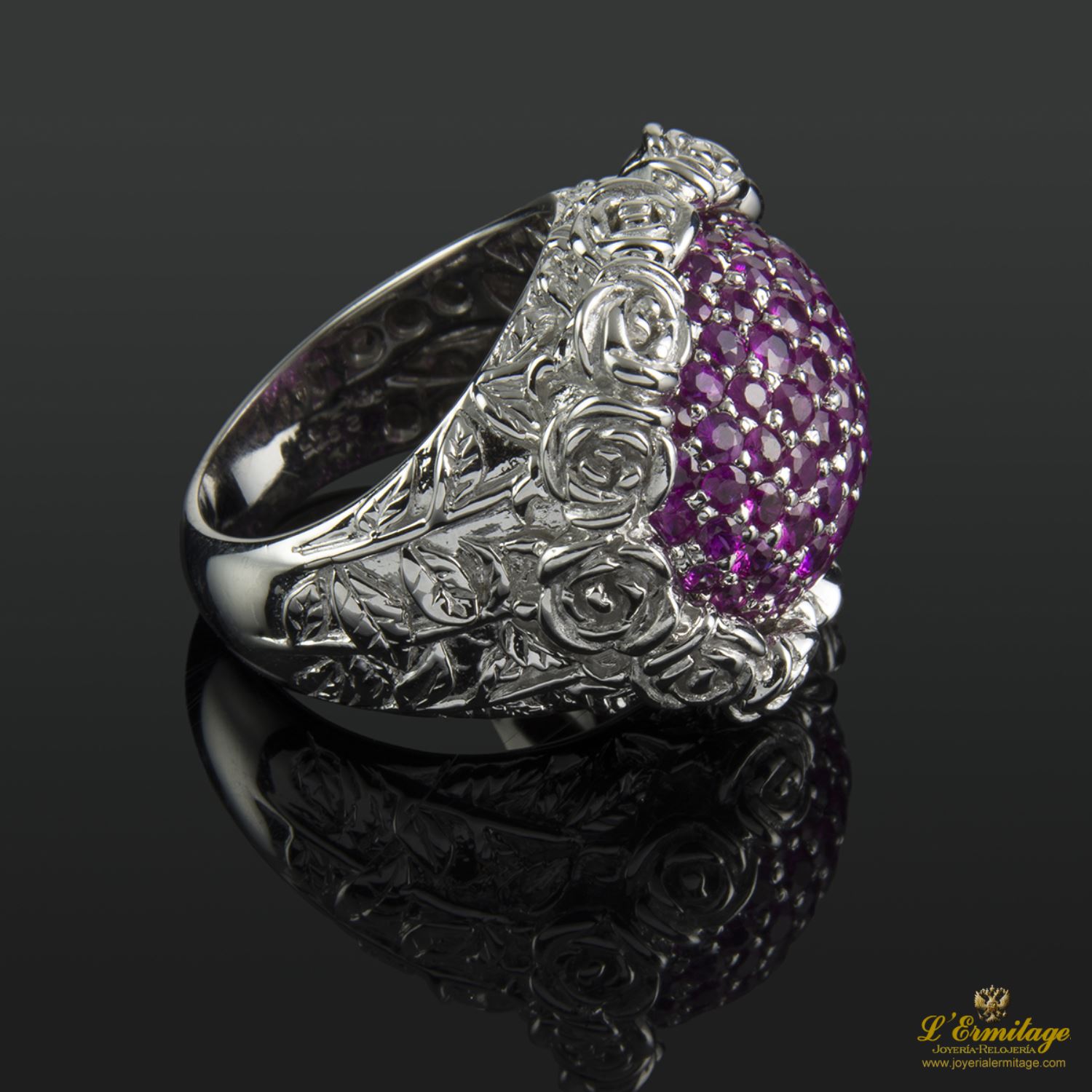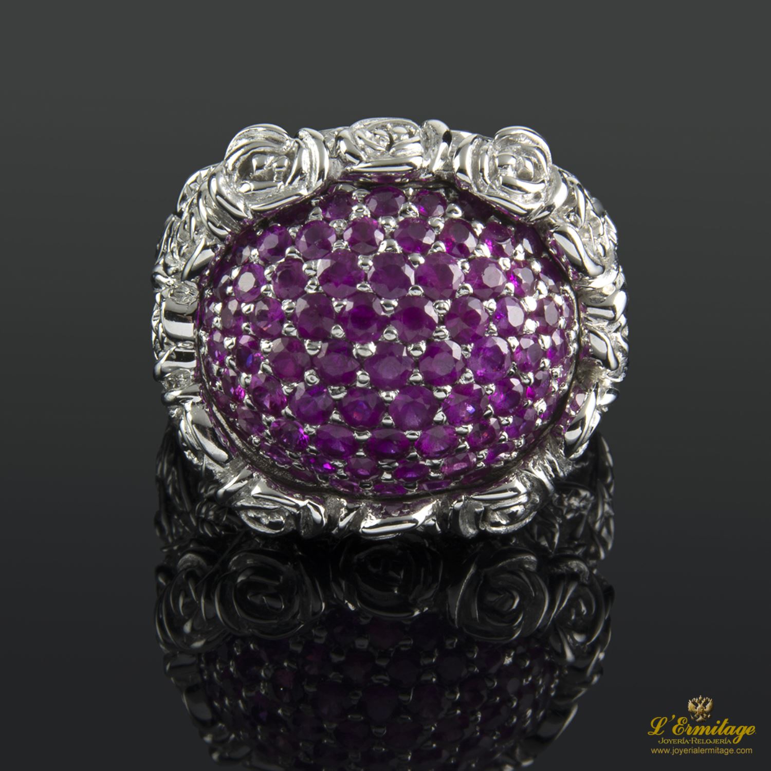 SORTIJA DE ORO BLANCO CON ADORNOS EN FLOR Y 68 RUBÍES NATURALES EN PAVÉ.