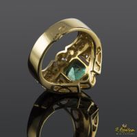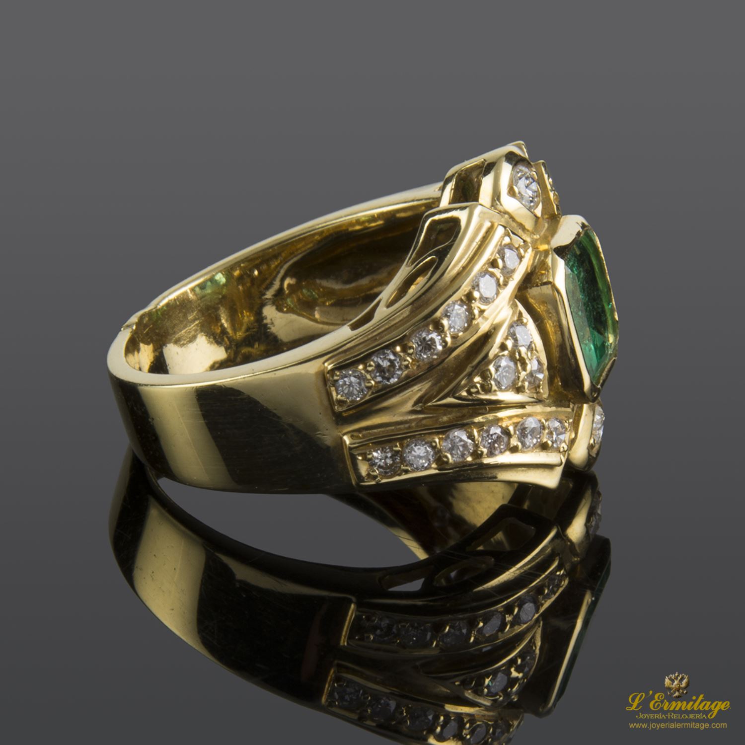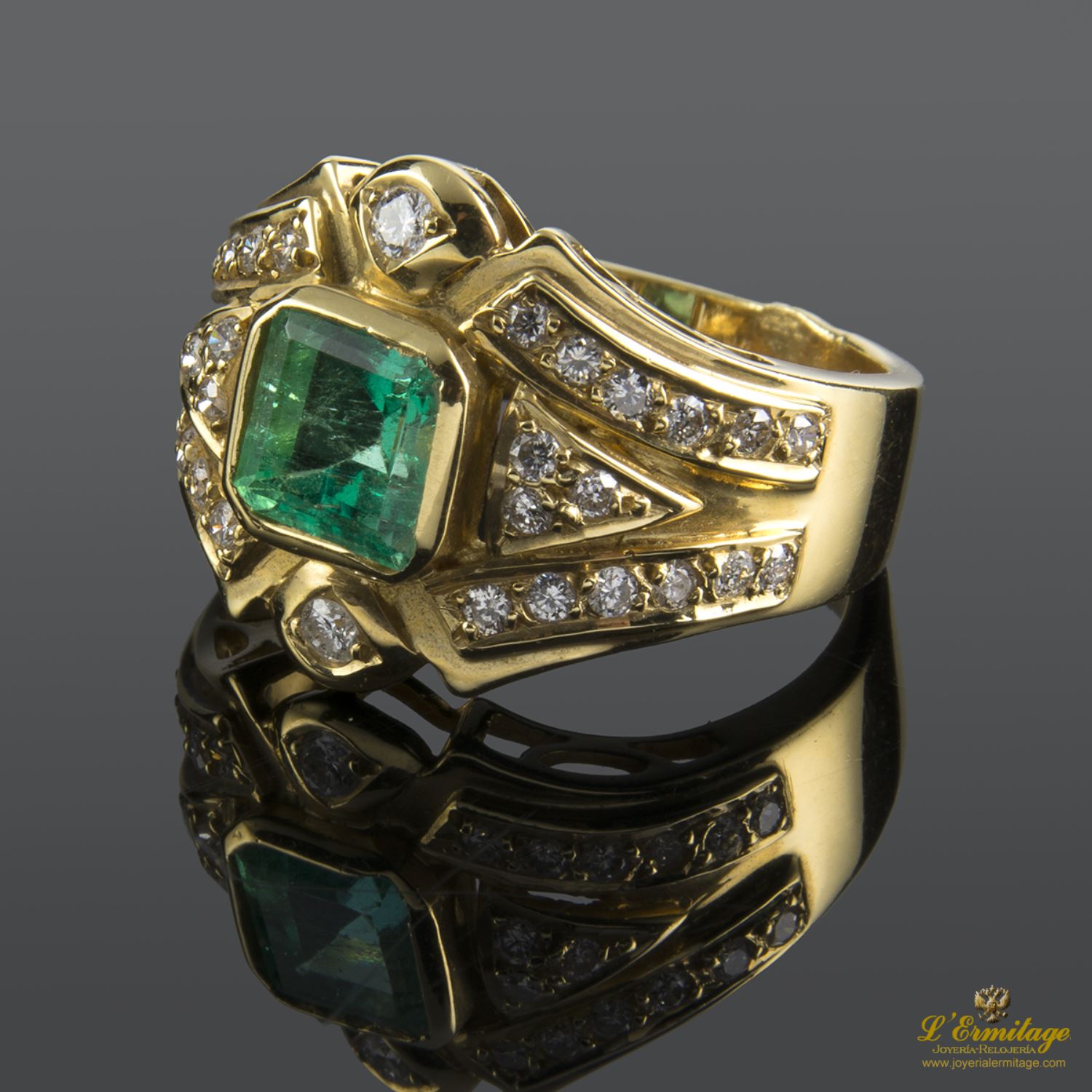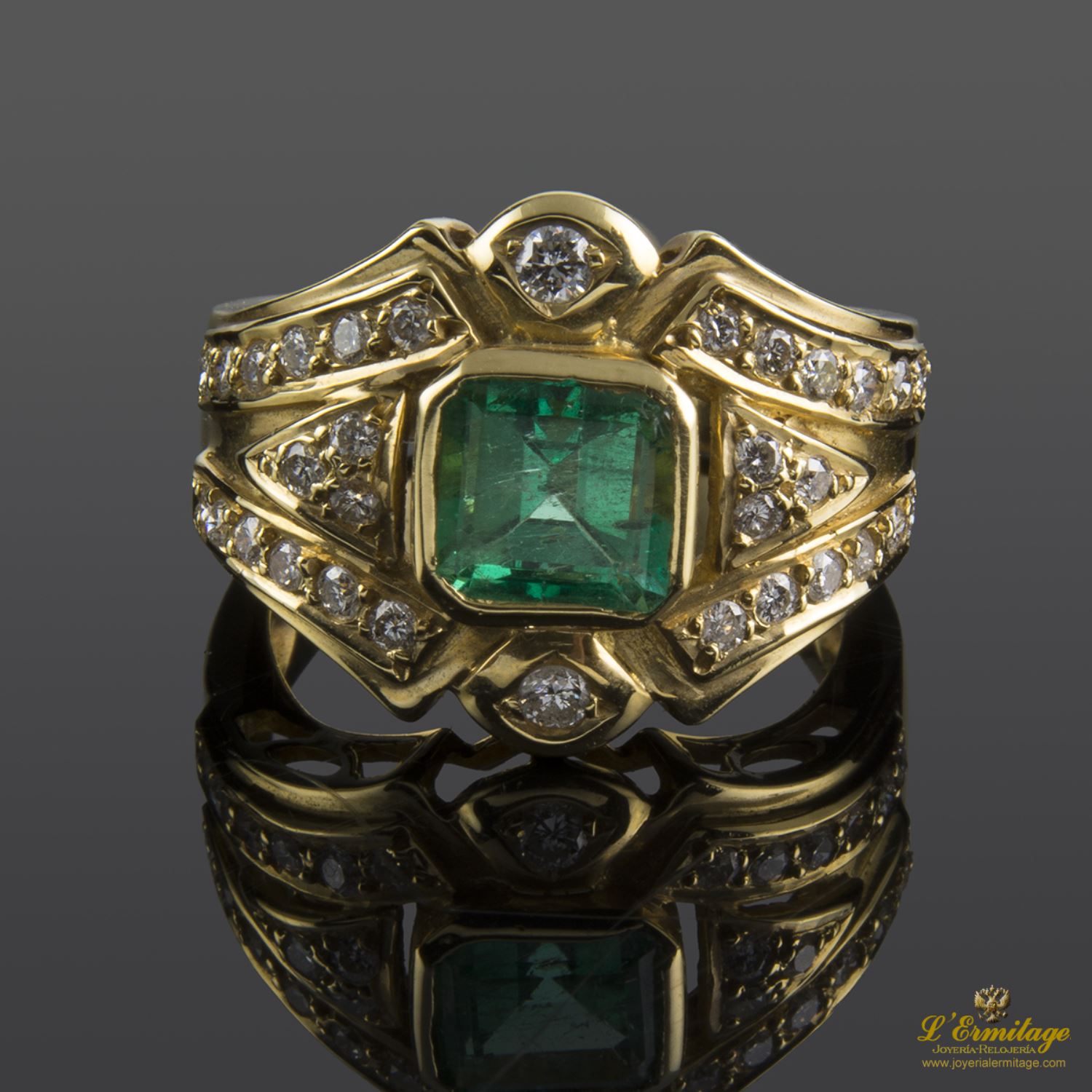 SORTIJA DE ORO AMARILLO CON 1 ESMERALDA NATURAL CENTRAL TALLA PRINCESA ENGASTADA EN CHATÓN Y 32 DIAMANTES NATURALES TALLA BRILLANTE ENGASTADOS EN GRANO.