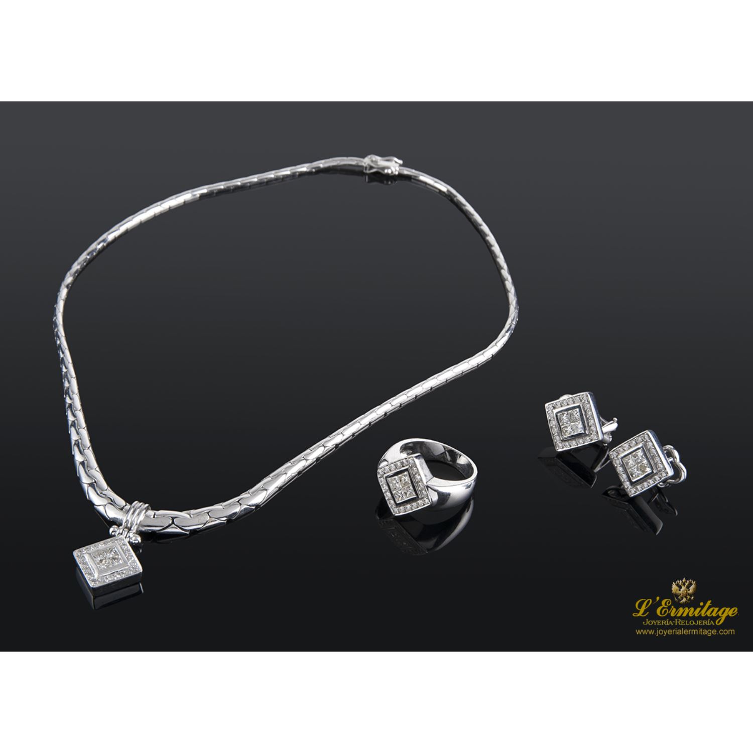 ANILLO DE ORO BLANCO CON 4 DIAMANTES NATURALES TALLA PRINCESA ENGASTADOS EN CHATÓN INVISIBLE Y CERCO DE DIAMANTES NATURALES TALLA BRILLANTE